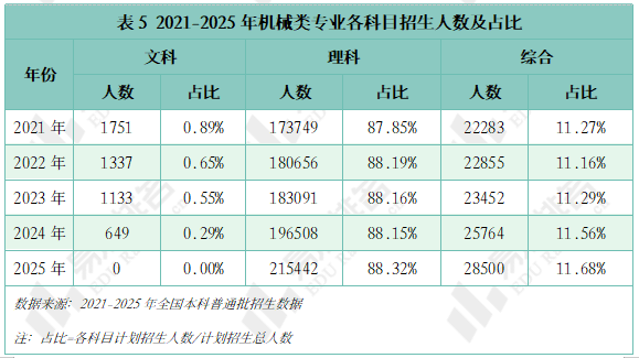 985院校机械类招生人数波动式下降,本年达到五年来最低,较2024年缩减8。3%,其他各条理院校则有3%-12%的涨幅,以更大的体量支持机械类招生总规模的抬升。近年,985院校缩减机械类专业招生规模已是常态,2021-2023年“三连降”,2024年急速回升,本年又起头下滑,华中科技大学、大连理工大学较客岁降幅达28%、23%。虽说机械类专业有所回温,但并非大热专业,尚处于新老专业更替期间,保守专业仍是招生从力,这就导致部门院校正在招生策略调整时将更多比例投放至市场需求度更高的专业,以“机械五虎”之一华中科技大学为例,2025年机械类招生打算较上一年降幅高居各专业类第一,电子消息类专业则扩招最多。至2025年完全归零,理科、分析科目标招生人数趋于不变,可知本年招生打算削减的部门多来自文科\汗青科目。